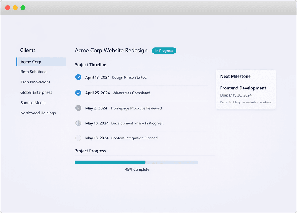 Post updates as you work. They see progress in real-time. No more "where are we at?" emails.